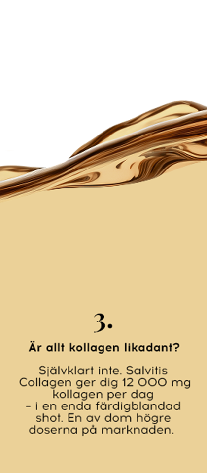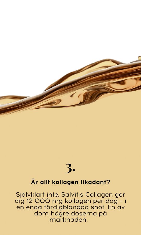 Kollagenproduktionen minskar med cirka 1 % per år. Fina linjer, torr hud och en mattare hudton kan börja visa sig. Daglig användning av Salvitis Collagen ger en kraftfull dos kollagen, vitaminer och mineraler. Salvitis Collagen – din allierade mot de första synliga ålderstecknen.